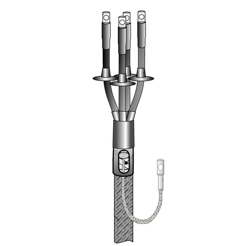 На разделанные жилы кабеля поверх жильной изоляции усаживаются изолирующие трубки (1). Корешок разделки герметизируется изолирующей перчаткой с внутренним клеевым подслоем (2). На жилы кабеля устанавливаются наконечники с контактными срывными винтами (4) или оконцевание осуществляется другим способом (опрессовкой, пайкой) по желанию заказчика. Наконечники изолируются манжетами с клеевым подслоем (3). Соединение проводника заземления (7) с броней кабеля осуществляется с помощью пружины ППД (9). Узел заземления изолируется термоусаживаемой манжетой с клеевым подслоем (6). Муфты комплектуются фазными изоляторами (по одному на каждую жилу) (10).